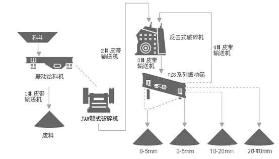 机制砂石生产工艺主要有两段破碎和三段破碎两大类,小型机制砂石生产线多采用两段破碎筛分流程,某些大型机制砂石生产线因物料块度较大,多采用三段破碎筛分流程,采用四段破碎筛分流程的比较少。
